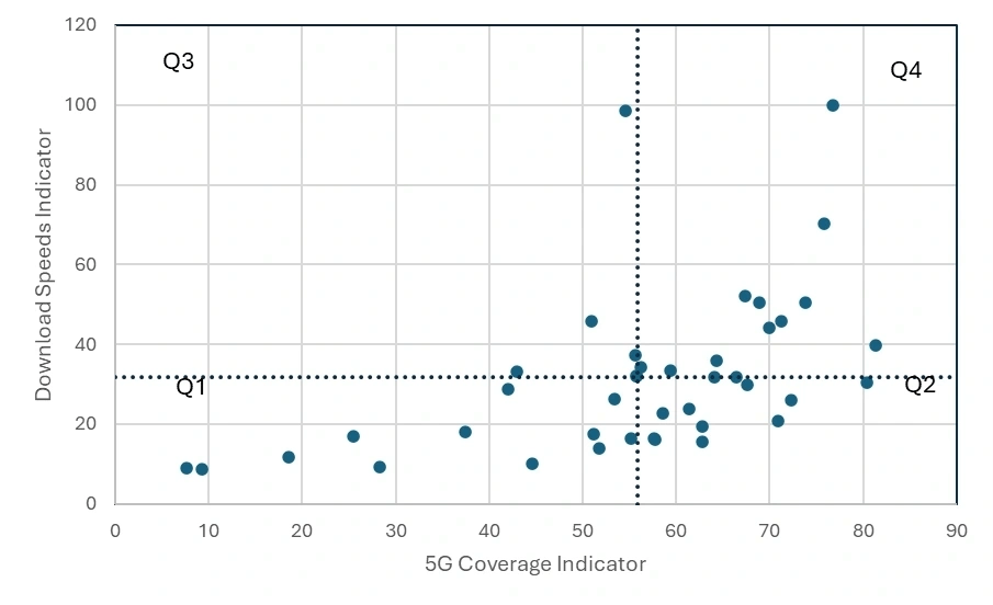 - There is a significant variance in the 5G download speeds indicator, ranging from 8.76 to 100.