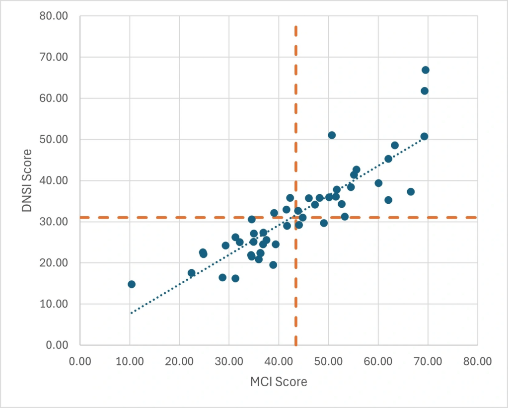 The graph below appears to show the relationship between MCI Score (x-axis) and DNSI Score (y-axis), represented as a scatter plot with a trend line. There is a clear positive correlation between MCI and DNSI scores.