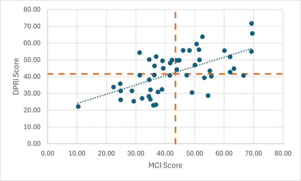 This graph shows the correlation seems moderate relationship between MCI Score (x-axis) and DPRI Score (y-axis) displayed as a scatter plot with a trend line.