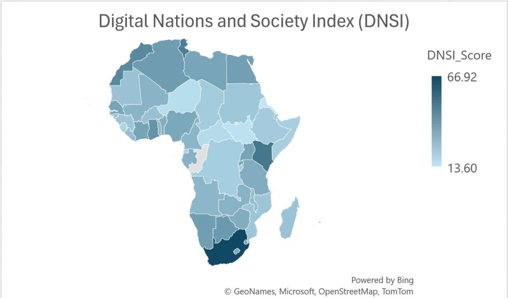 The map shows DNSI scores across African countries, with higher scores (darker blue) indicating more developed digital infrastructure and societal adoption.