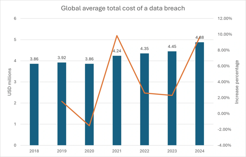 - The cost of data breaches has risen significantly over the seven years, climbing from 3.86 million in 2018 to 4.88 million in 2024, a 26.4% cumulative increase.