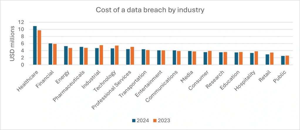 This graph compares the average cost of data breaches across various industries for 2023 and 2024.