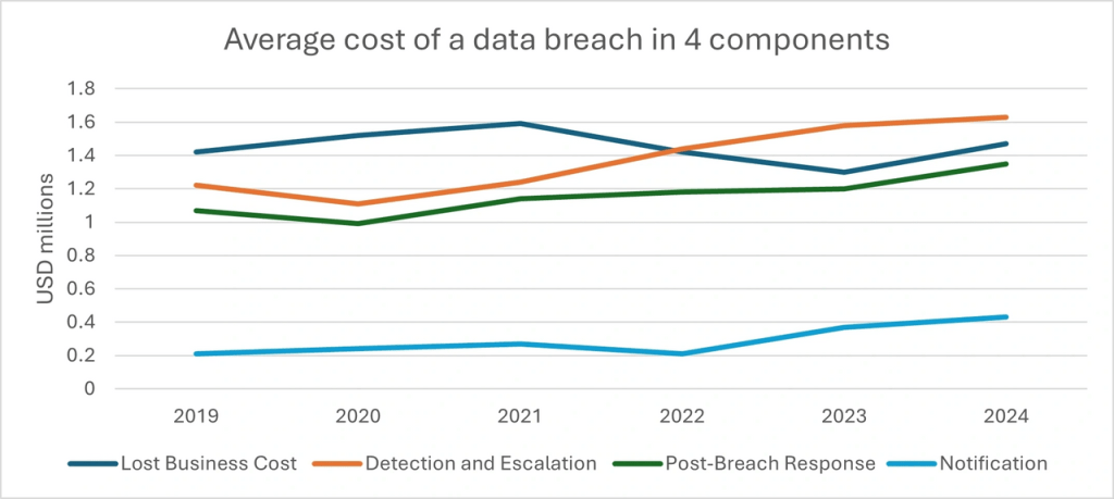 The average cost of a data breach from 2019 to 2024 is divided into four key areas: