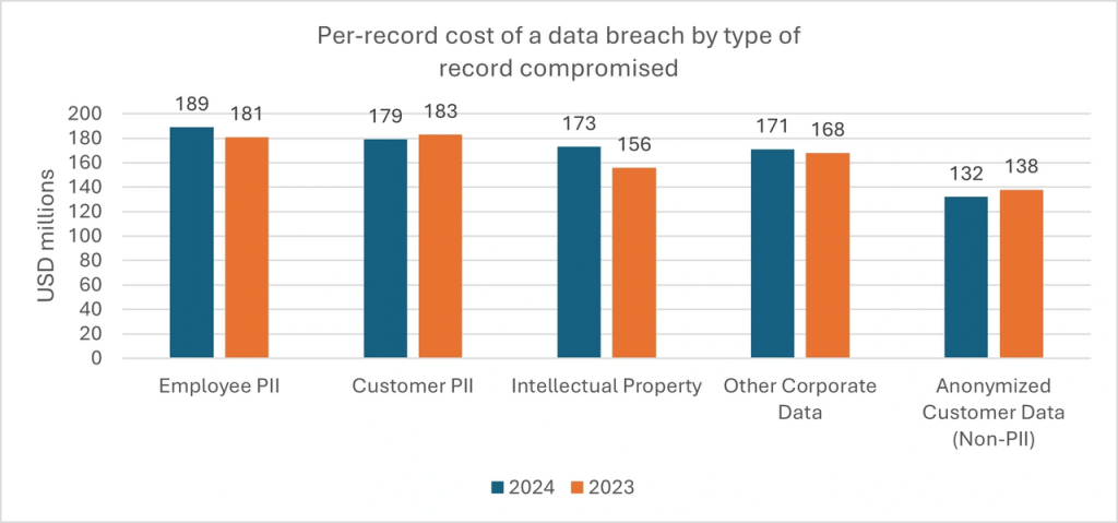 - Employee PII (Personally Identifiable Information): This category likely represents the highest cost per record, indicating that breaches involving employee data are particularly costly. This could be due to the sensitive nature of the information and the potential for identity theft or fraud.