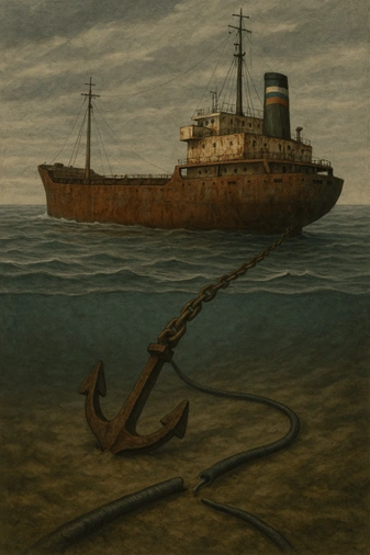 – Illustration of a so-called Russian “ghost” vessel (e.g., bulk carrier) dragging its stern anchor through a subsea optical communications cable. It is an informal term that describes a Russian vessel operating covertly or suspiciously, often without broadcasting its identity or location using the Automatic Identification System (AIS), the global maritime safety protocol that civilian ships must use.