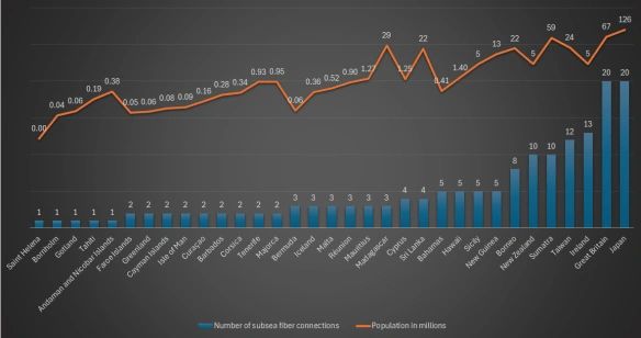 – The bar chart shows the number of subsea cable connections, while the orange line represents each island’s population (plotted on a log-scale), highlighting disparities between connectivity and population density.