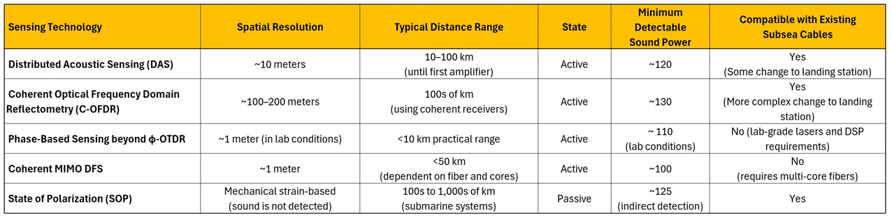 – Performance characteristics of key optical fiber sensing technologies for subsea applications. The table summarizes spatial resolution, operational range, minimum detectable sound levels, activation state, and compatibility with existing subsea cable infrastructure. Values reflect current best estimates and lab performance where applicable, highlighting trade-offs in detection sensitivity and deployment feasibility across sensing modalities. Values reflect current best estimates and lab performance where applicable, highlighting trade-offs in detection sensitivity and deployment feasibility across sensing modalities. Range depends heavily on system design. While traditional C-OFDR typically operates over short ranges (<100 m), advanced variants using telecom-grade coherent receivers may extend reach to 100s of km at lower resolution. This table, as well as the text, considers the telecom-grade variant of C-OFDR.