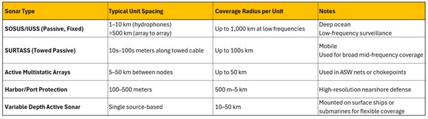 – Subsea sensing use cases and corresponding detection performance. The table outlines representative sound power levels, optimal sensing technologies, environmental suitability, and estimated detection distances for key maritime and defense-related use cases. Detection range is inferred from typical source levels, local noise floors, and sensing system capabilities in Arctic coastal and oceanic environments.