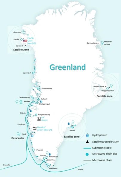 – This chart illustrates the Greenlandic telecommunications provider Tusass’s infrastructure (among other things). Note that Tussas is the incumbent and only telecom provider in Greenland. Currently, five hydropower plants (shown above; location is only indicative) provide more than 80% of Greenland’s electricity demand. Greenland’s new international airport became operational in Nuuk in November 2024. Source: from the Tusass Annual Report 2023 with some additions and minor edits.