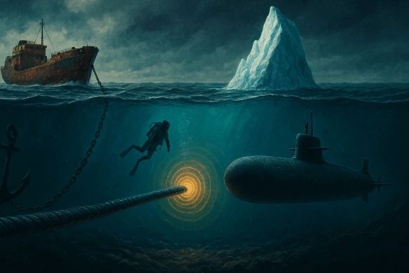 – A diver approaches a sensing fiber-optic submarine cable beneath the icy waters of the North Atlantic, as a rusting cargo ship floats above and a submarine lurks nearby. The cable’s radiant rings symbolize advanced sensing capabilities, detecting acoustic, seismic, and movement signals. Yet, its exposure also reveals the vulnerability of subsea infrastructure to tampering, espionage, and sabotage, especially in geopolitically tense regions like the Arctic.