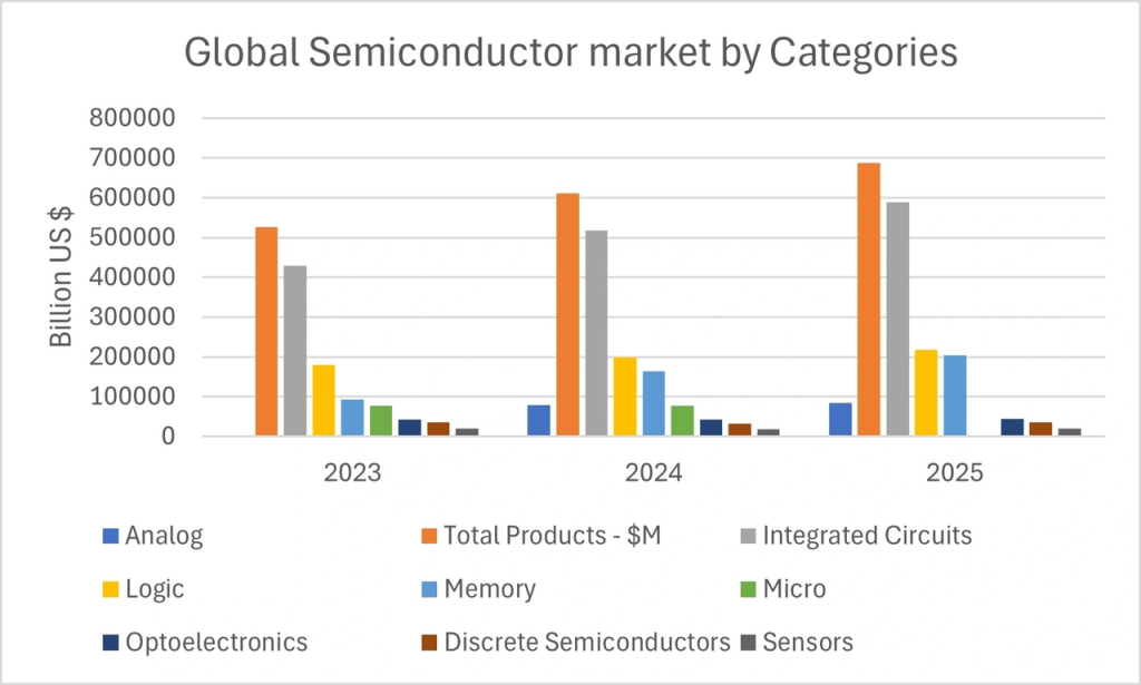 The market is divided into several categories, with Total Products, Integrated Circuits, and Logic being the largest segments. Memory and Micro components also represent significant portions. All categories show growth over the three years.