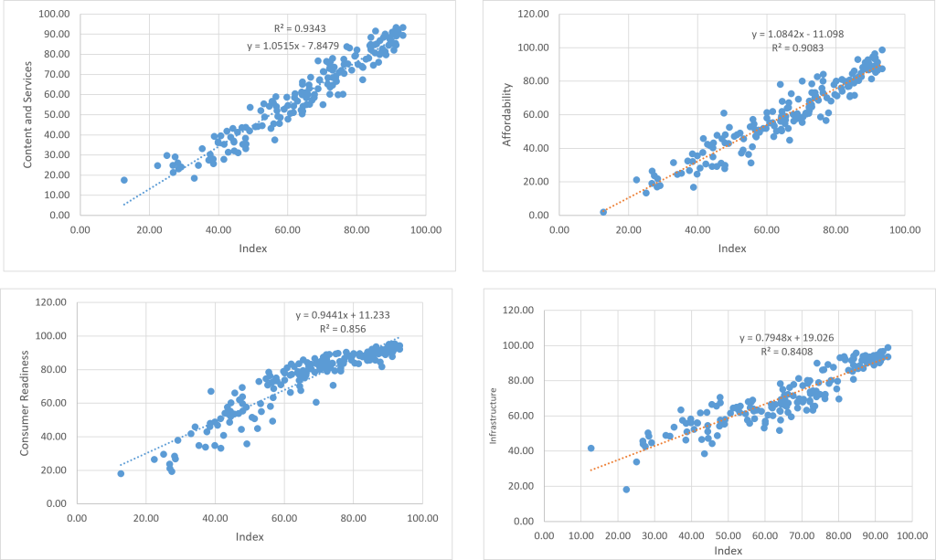 Furthermore, the analysis reveals strong interdependencies between the enablers. For instance, Content & Services has a high correlation with Consumer Readiness (0.8736), indicating that a population with higher digital skills and awareness is better able to engage with and drive demand for relevant content. Similarly, the strong link between Affordability and Infrastructure (0.8348) highlights the symbiotic relationship between network investment and the pricing of services.